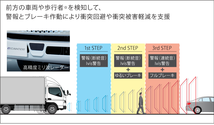 • The Advanced Emergency Braking System (AEBS) detects vehicles ahead, as well as moving pedestrians, through the millimeter-wave radar installed in the front bumper. The AEBS activates braking and warns the driver when risk of collision is detected.
